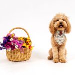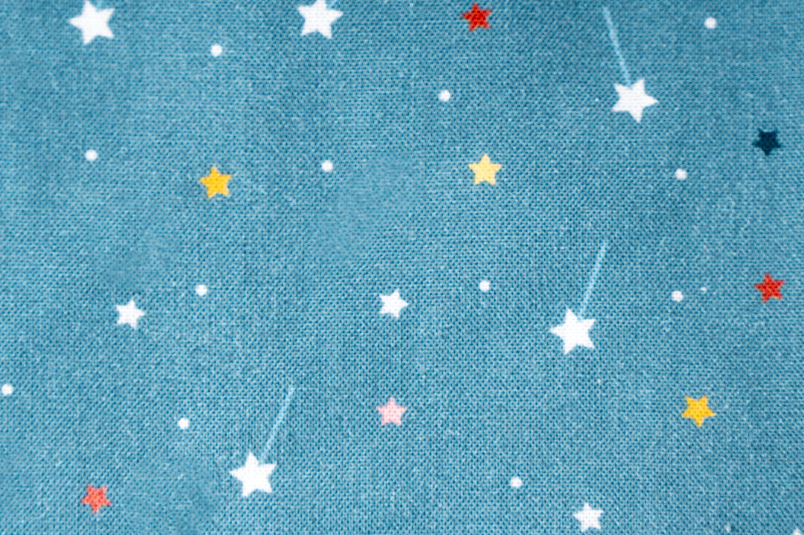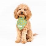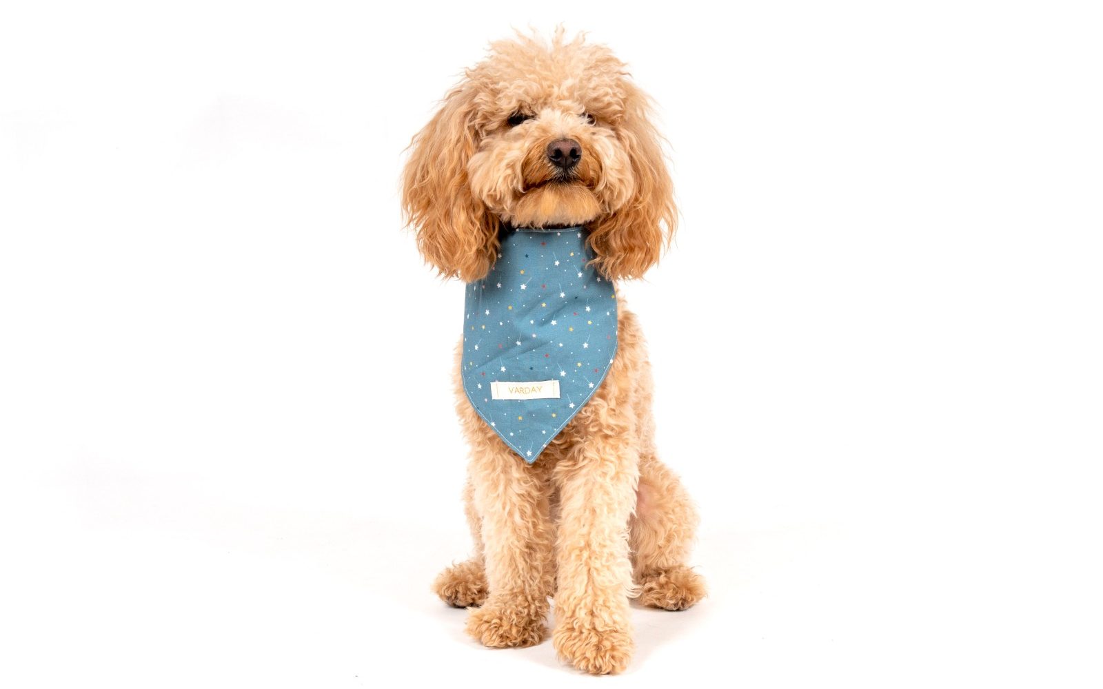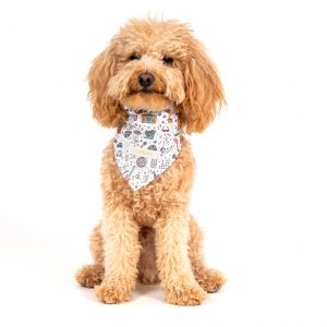 Bandana atada con velcro con estampado de cometas de colores sobre fondo azul.