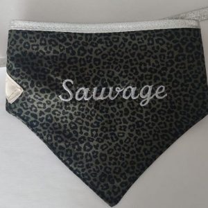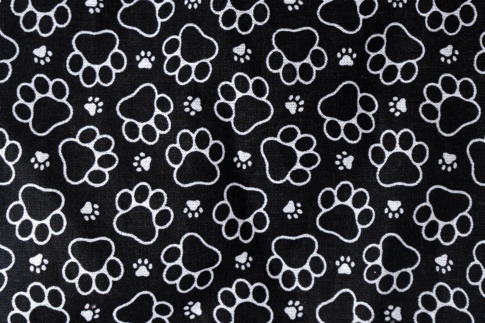 Bandana atada con velcro con estampado de huellas blancas sobre fondo negro.