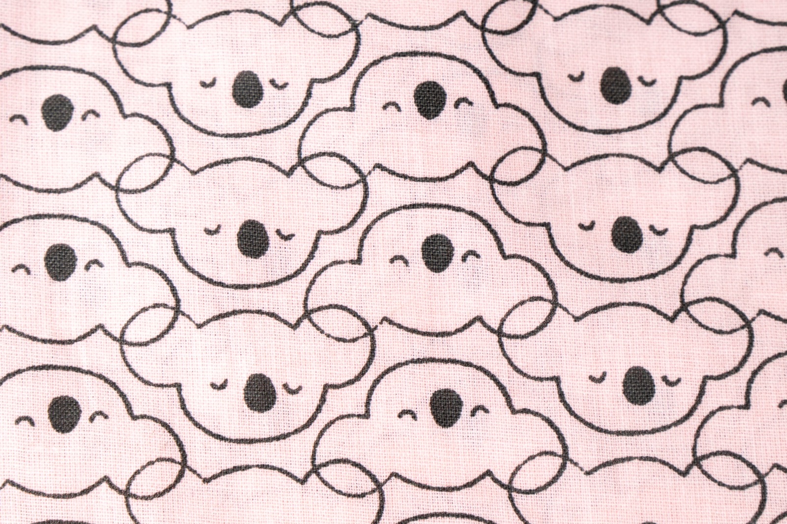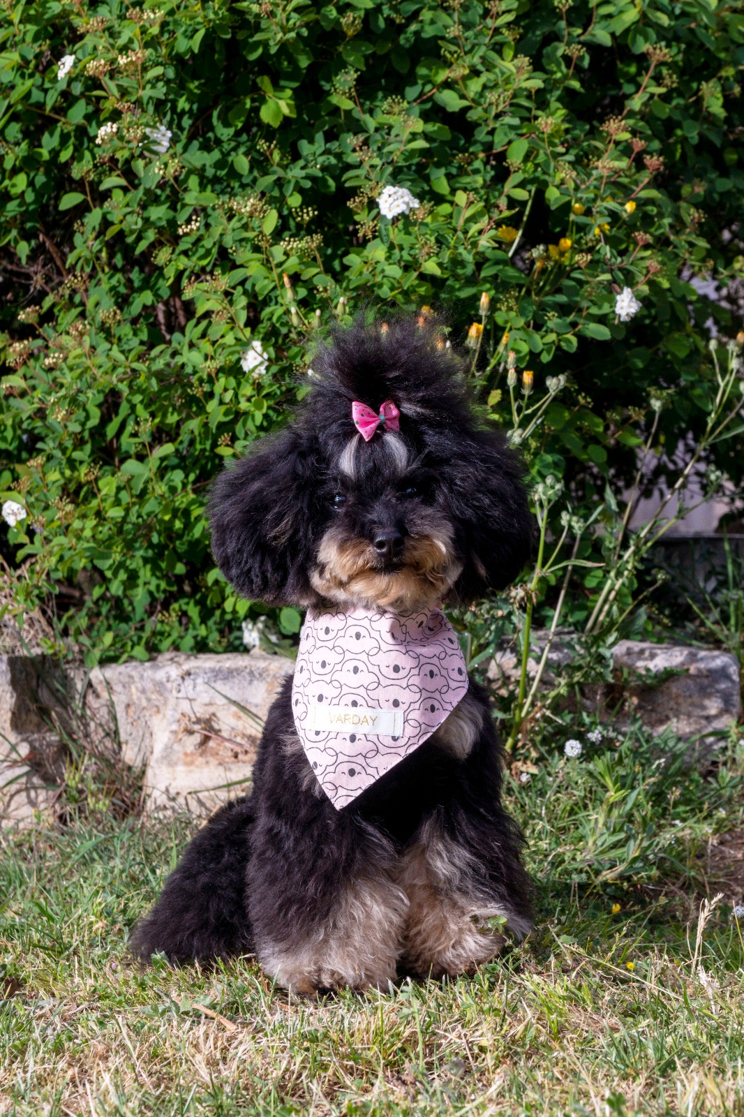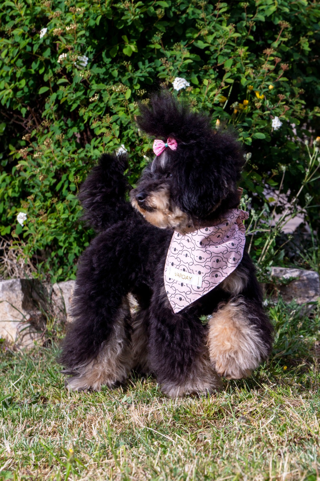 Bandana atada con velcro con estampado de koalas sobre fondo rosa.