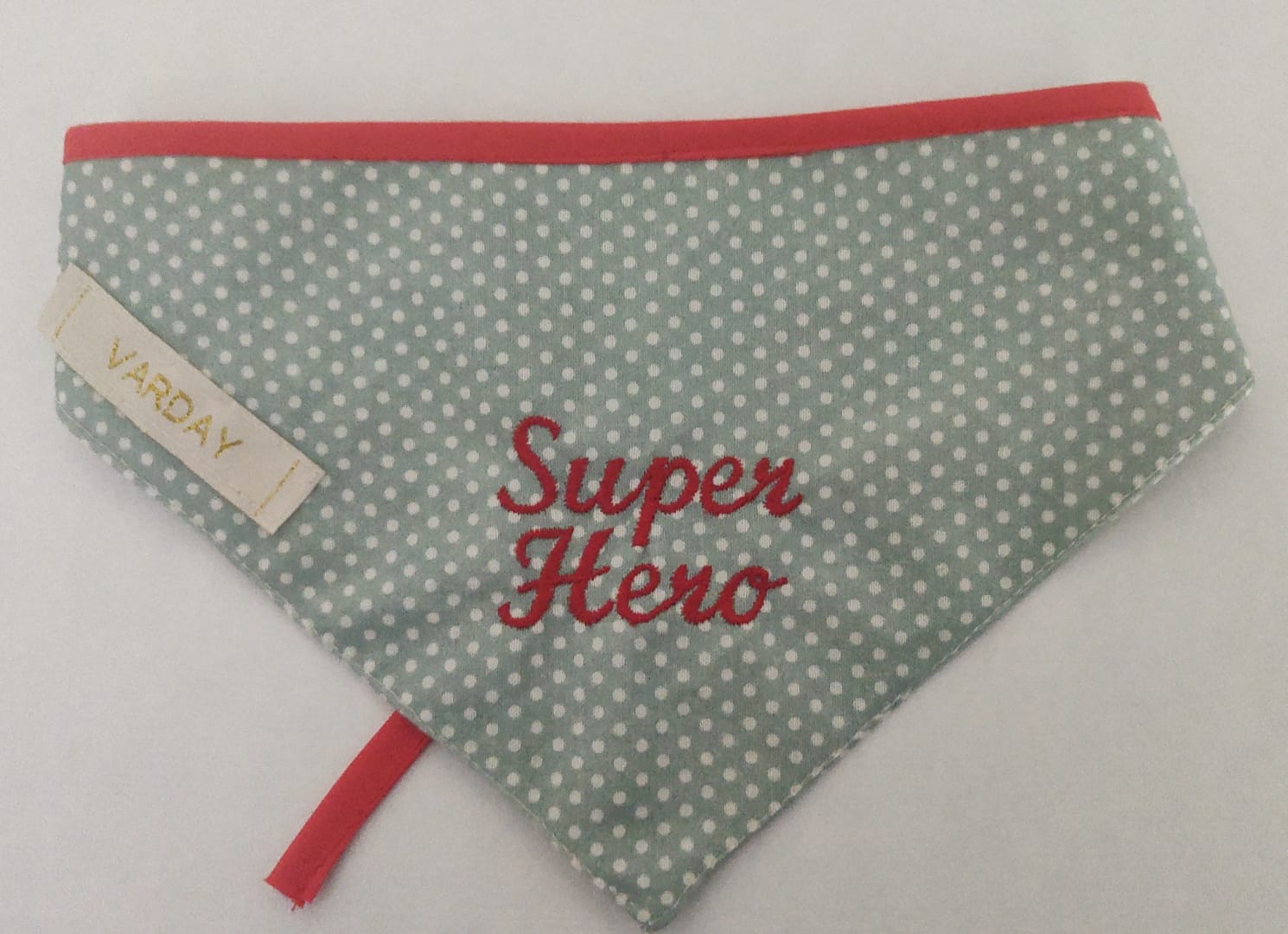 Bandana con estampado de mini lunares en tono azulado, con bordado central: Super Hero en rojo.