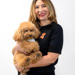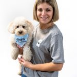 Camiseta con patrón cuadrado, de manga corta en color blanco con pequeño detalle de estampado de caniche negro en el lado izquierdo.
