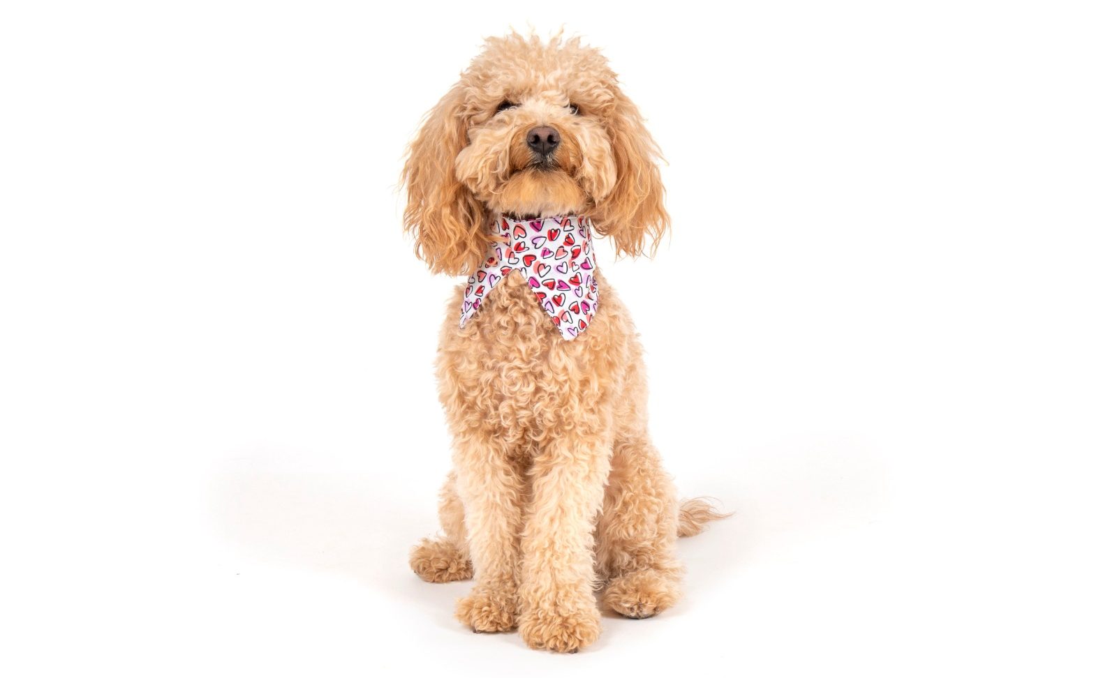Cuello camisero atado con velcro/para poner con el collar con estampado de corazones en fondo blanco.
